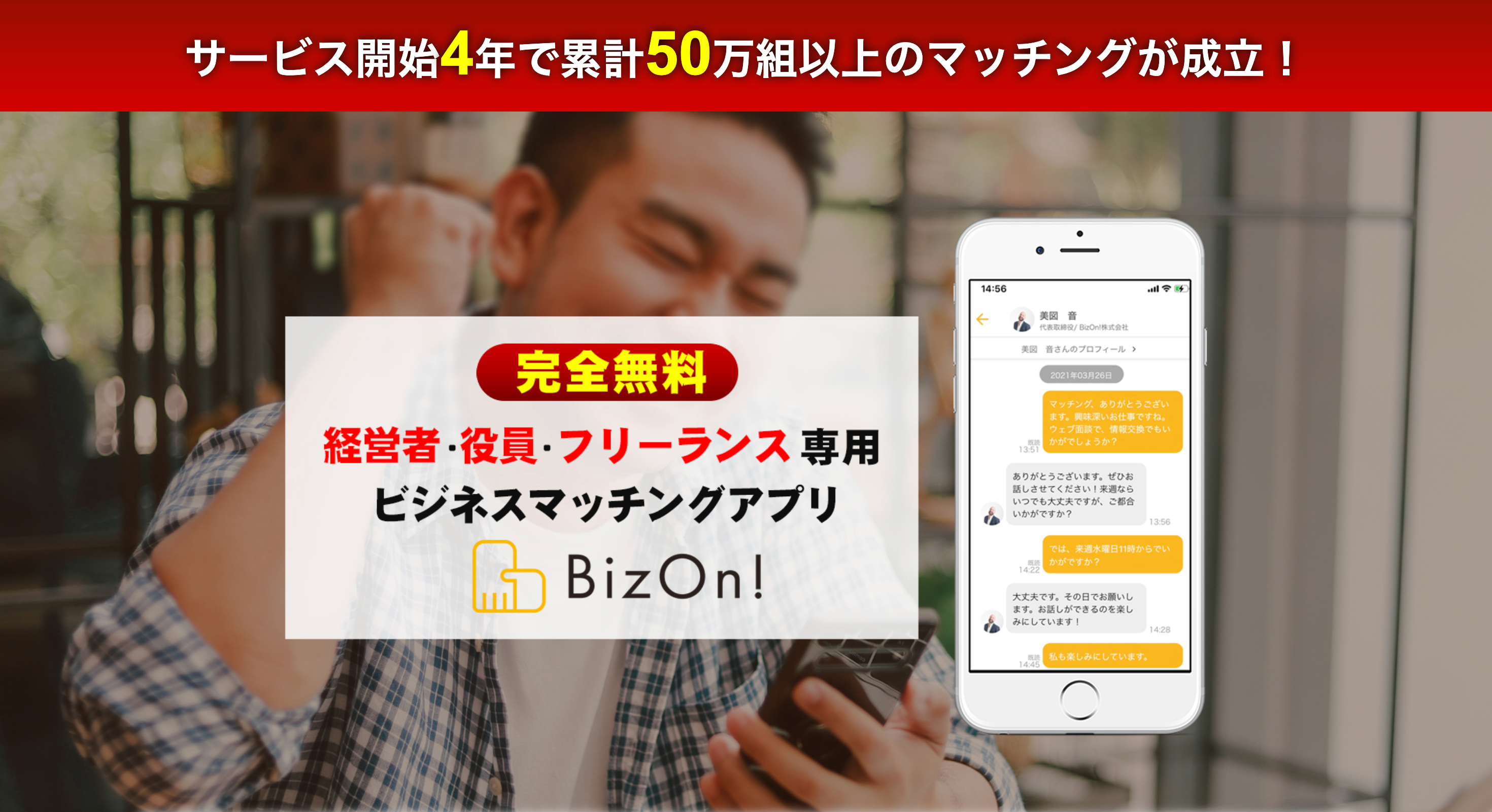 BizOn!(ビズオン)は、経営者・フリーランス専用のビジネスマッチング機能付きSNSアプリです。