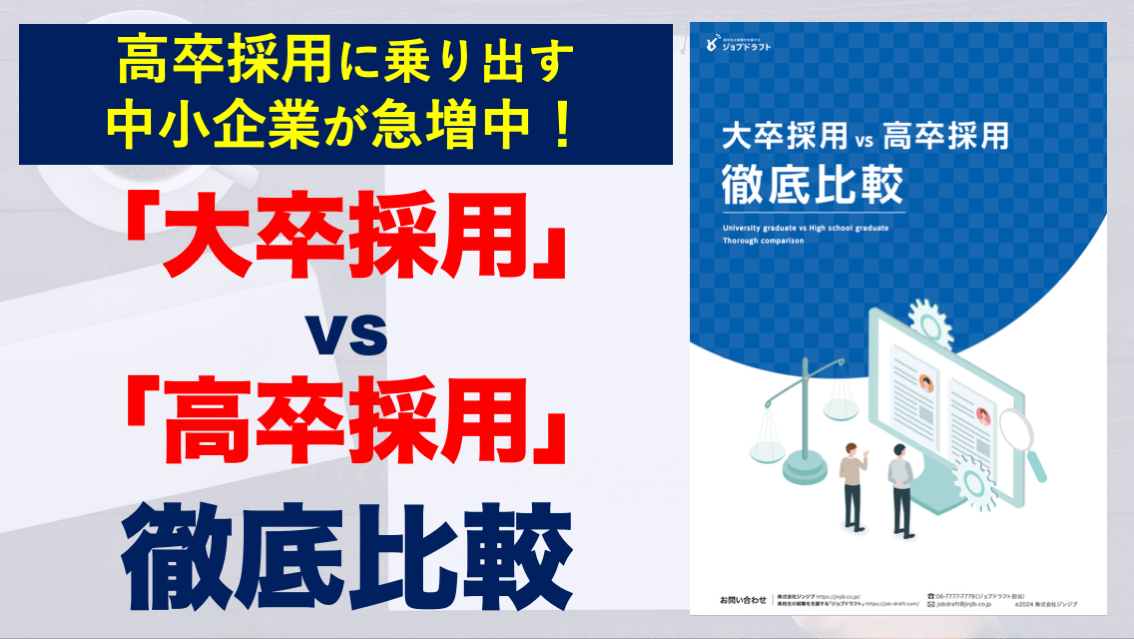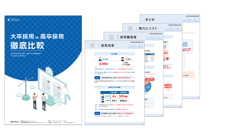 そこで、「大卒採用」と「高卒採用」を徹底比較した無料レポートをご用意しました。ぜひ無料ダウンロードの上、ご一読ください!