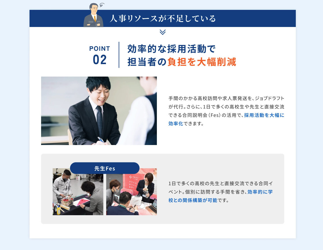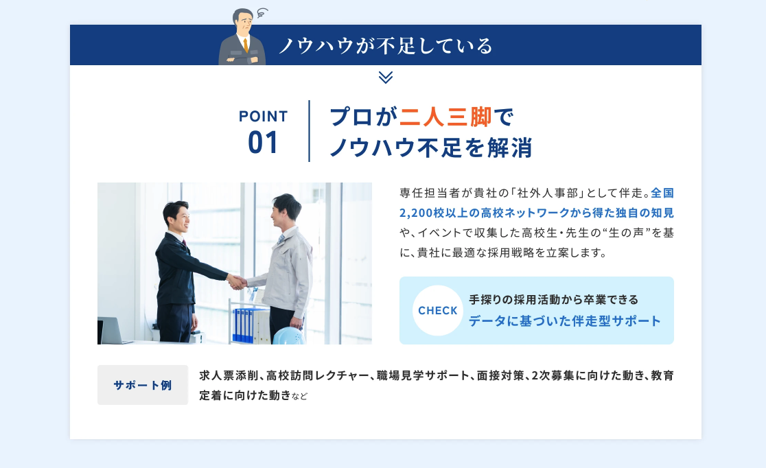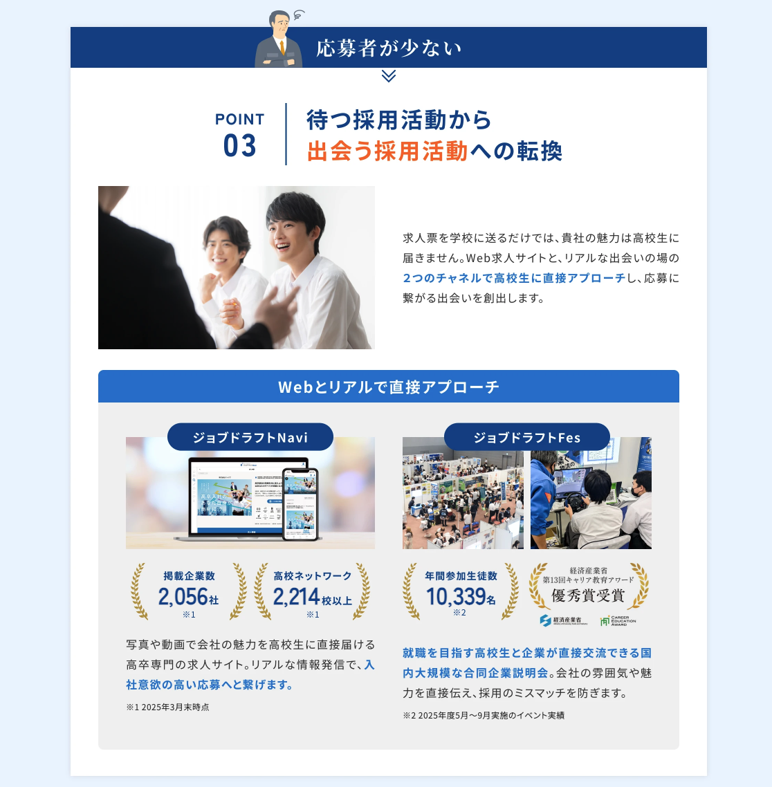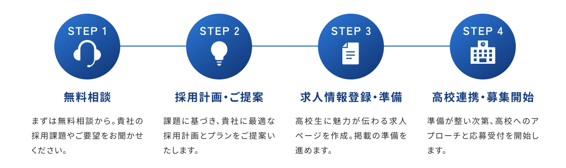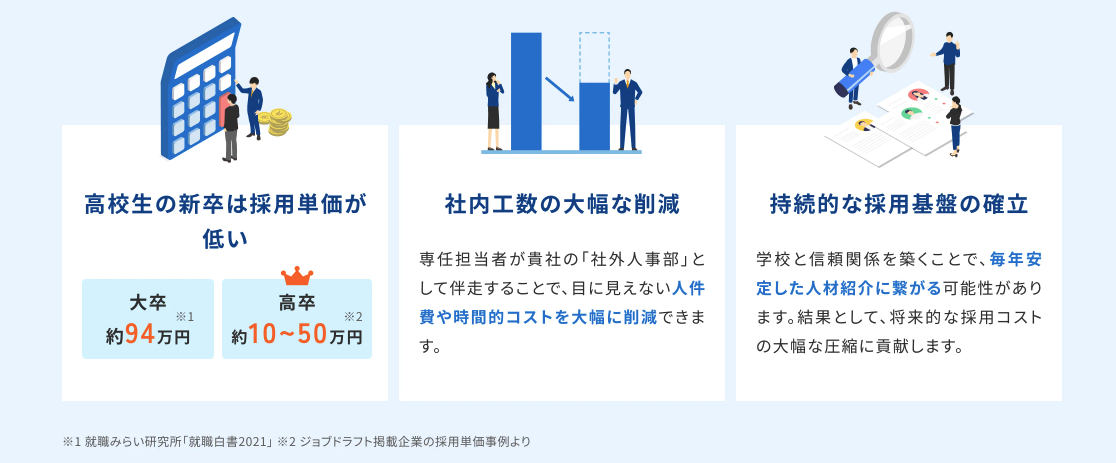 当社のサービスは、高校生が自分で求人情報を知れることを目的に、高校の進路指導教員を通じての応募を行うことを前提とした設計をしており、求人サイトや、イベント出展いただくことで、学校斡旋の仕組みを逸脱することはございません。