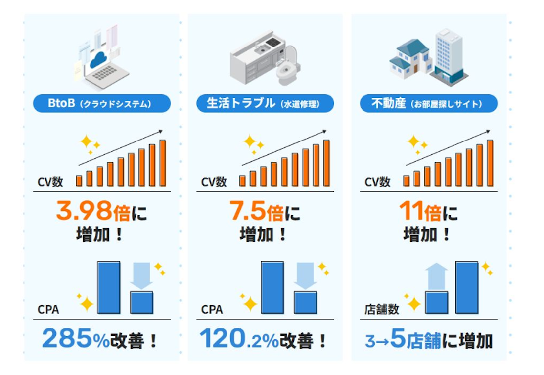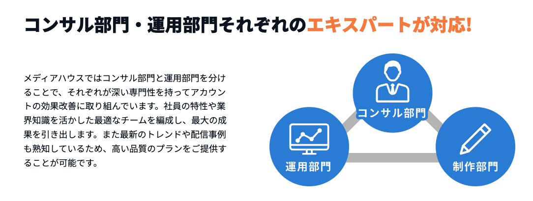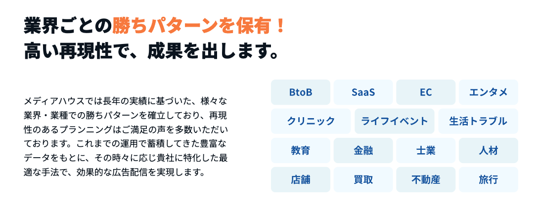 戦略から制作、運用までを一気通貫でサポートし、コンサル・運用・制作の各エキスパートが深い専門性をもってお客様の課題解決に取り組みます。長年の様々な業界での実績から成果を出すための勝ちパターンを業界毎に確立しており、高い再現性で効果的な広告配信を実現します。