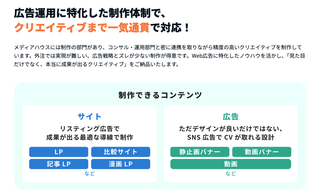 自社に、LPやバナー、動画などのクリエイティブを制作するための部隊をもっておらず、制作はすべてパートナー任せという代理店もあります。このような代理店では、運用の成果が上がらないときに、原因をクリエイティブのせいにすることがあります。