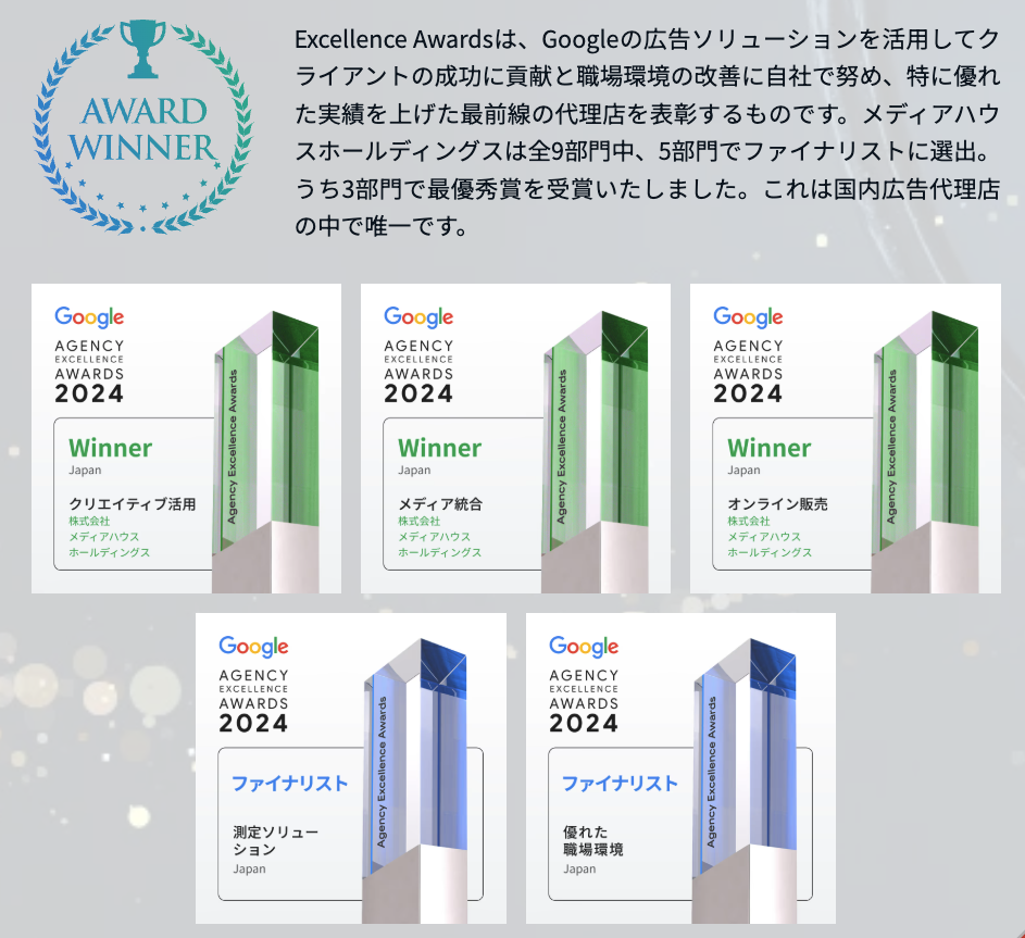 またGoogle主催の「2024 Agency Excellence Awards」では、国内で唯一3冠を受賞いたしました。
