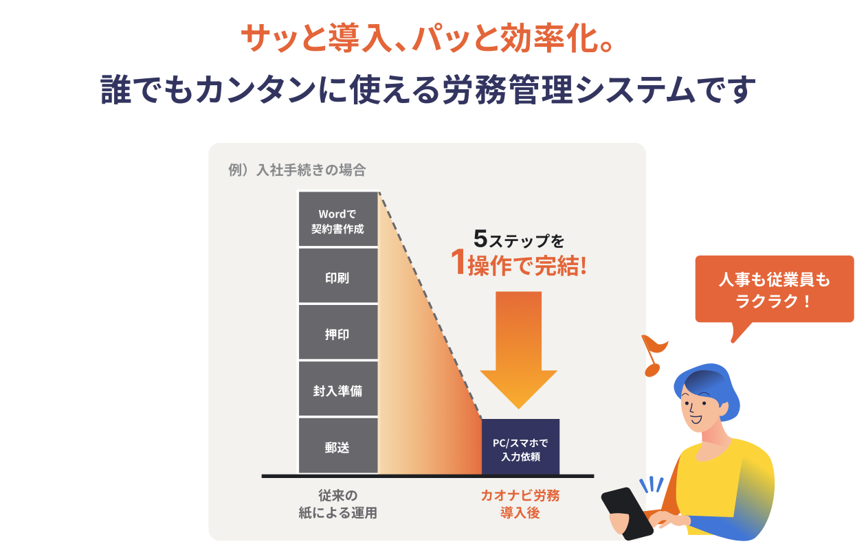 “はたらく”にテクノロジーを実装し個の力から社会の仕様を変える。タレントマネジメントシステム「カオナビ」や労務管理システム「カオナビ労務」などシステムにより、人材管理、労務管理領域にイノベーションを起こすことを目的としている会社です。