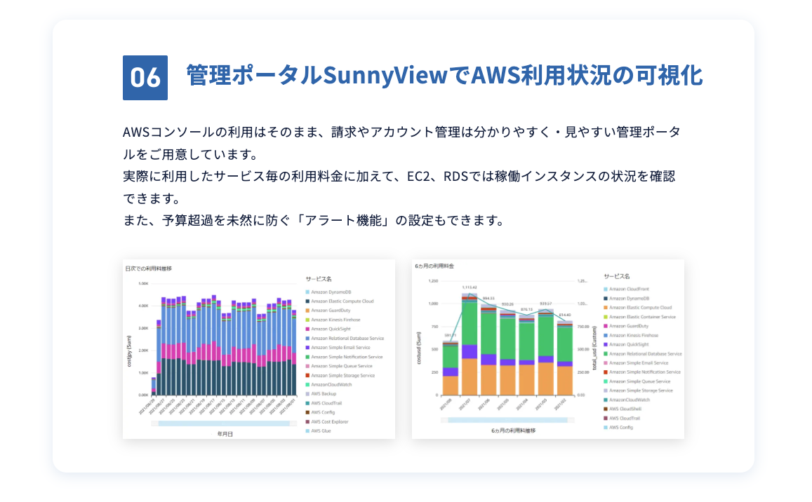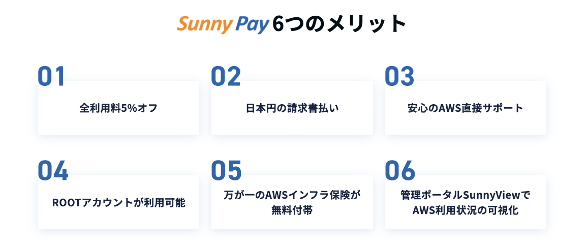 当社は、AWSの請求代行・コスト最適化支援を中心に、クラウド活用を総合的にサポートするITサービス企業です。Rootアカウントの譲渡不要でAWS公式サポートを継続利用できる「SunnyPay」を提供し、AWS利用料を一律5%割引でご利用いただけます。